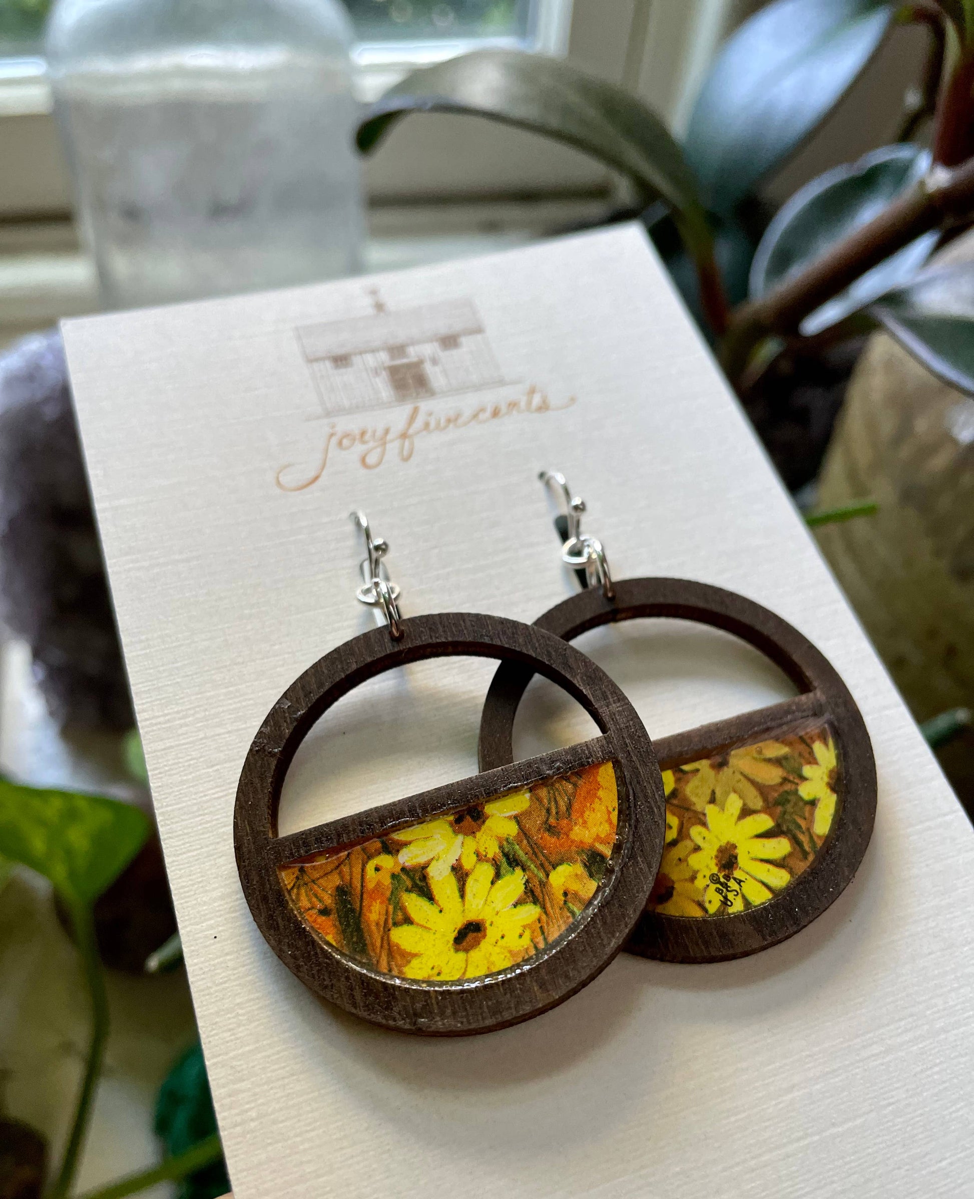 A collection featuring wooden elements that celebrates the natural balance of the environment. This sectioned circle earring design incorporates dark walnut stained wood bezels and crescent shaped imagery. Each uniquely asymmetrical pair has been repurposed from vintage playing cards. Layers of jewelry grade resin serve to protect and magnify. Earrings are light as air and secure to your ears with silverplated nickel free ear wires and silicone clutches.