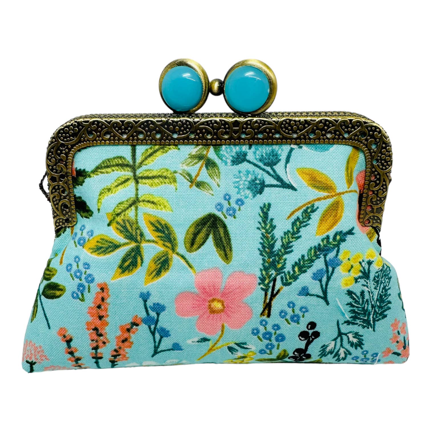ON‑THE‑GO Credit Card Clutch brings irresistible charm and function. Designed for shoppers who love color, craft, and convenience, each clutch is handmade in Charleston, SC. using premium 100% cotton fabric and fully lined in a coordinating print. Our signature 4.14" W x 2.36" H ancient bronze embossed lace frame adds a distinctive, elevated touch, complete with a kiss‑clasp lock and lotus‑head beads. The finished clutch measures 5.25" W x 4" H x 1.5" D-perfectly sized for credit cards, lipstick, keys, and other small essentials.