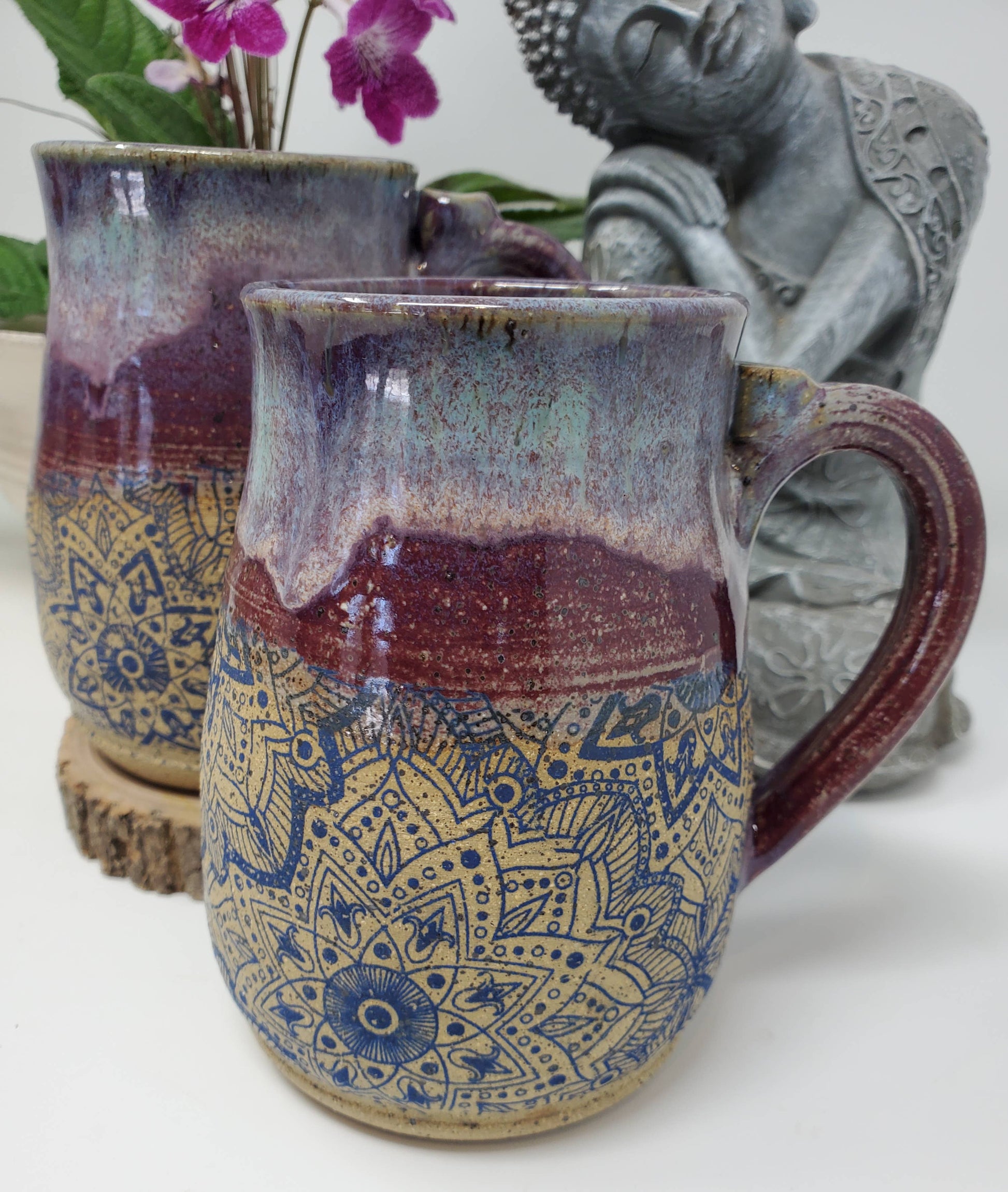 - Wheel-thrown/handmade ceramic mug with a blue Mandala print.