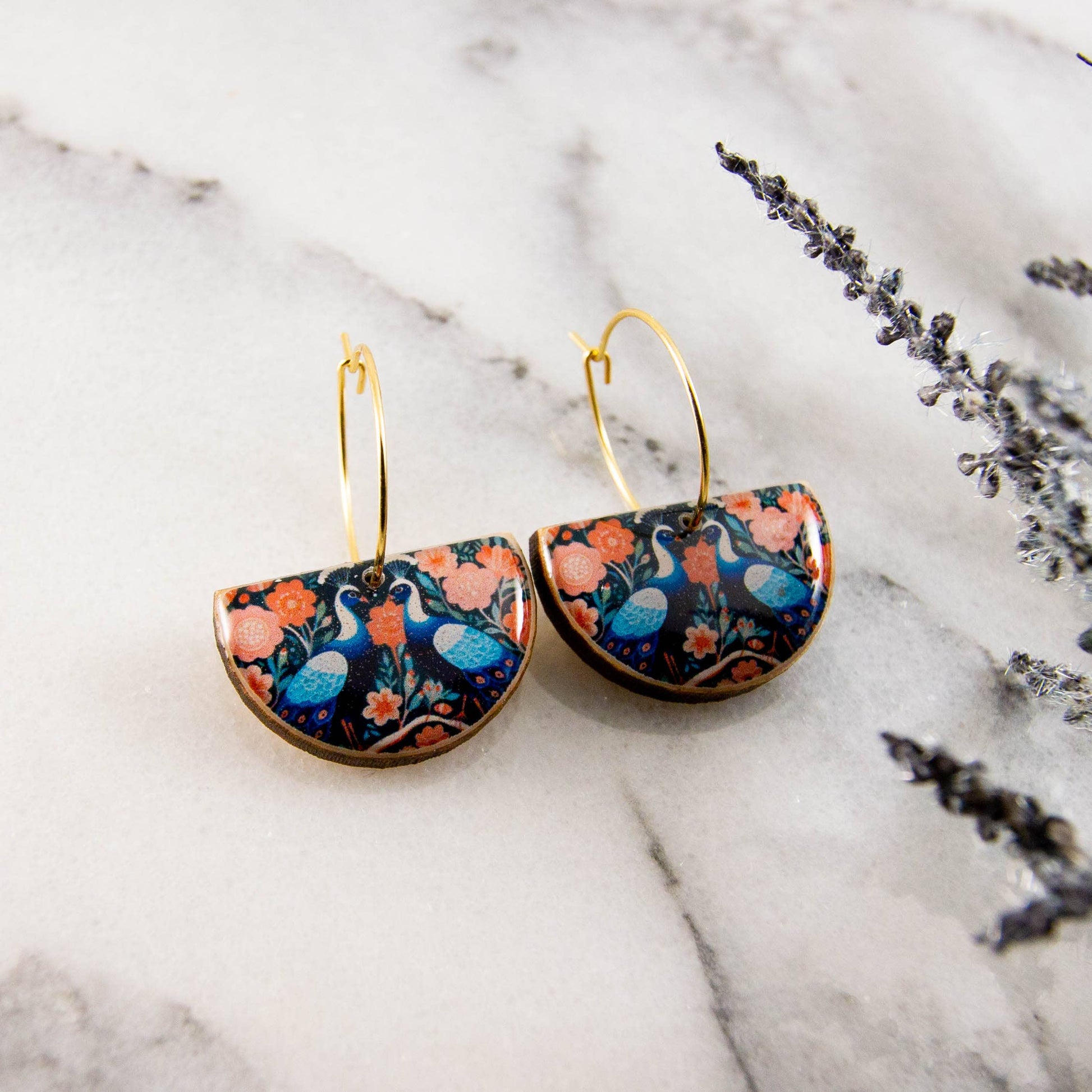 Stylish and dramatic, these sweet earrings are a perfect daily accessory! Featuring a vintage inspired peacock and flower illustration, rendered in shades of deep blue, pink, and coral.