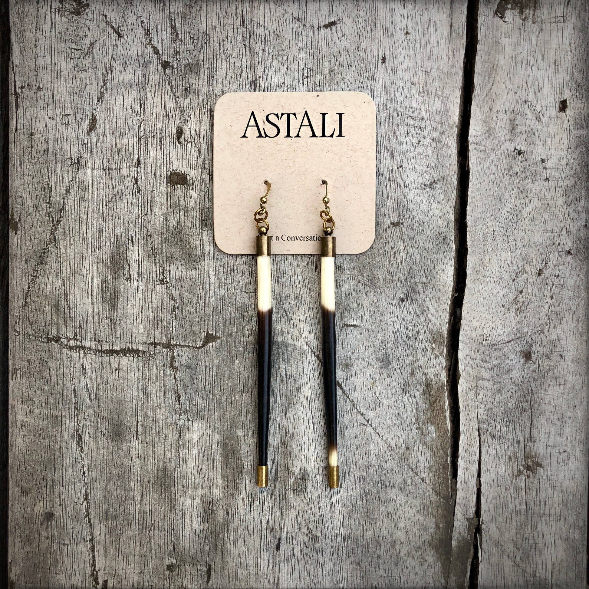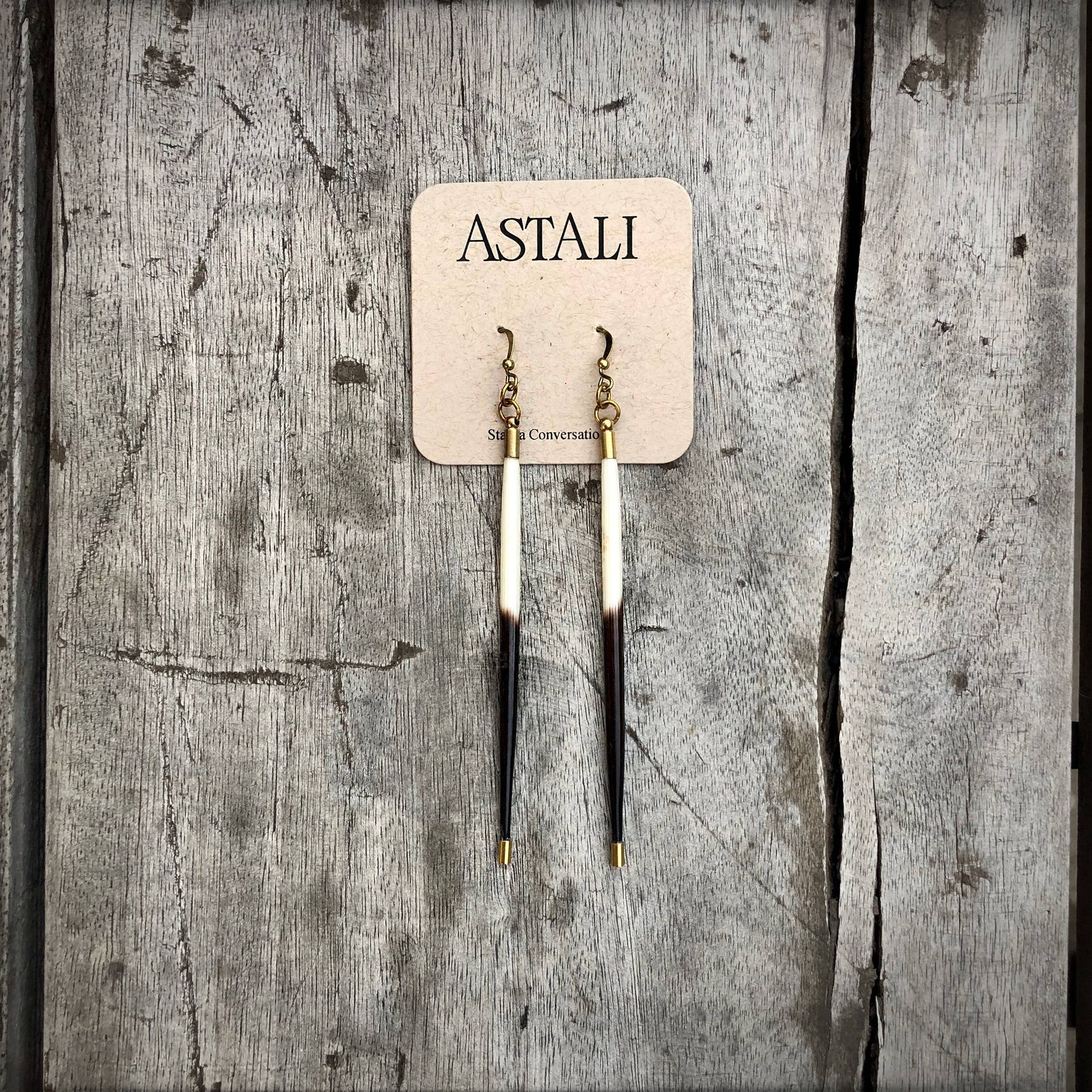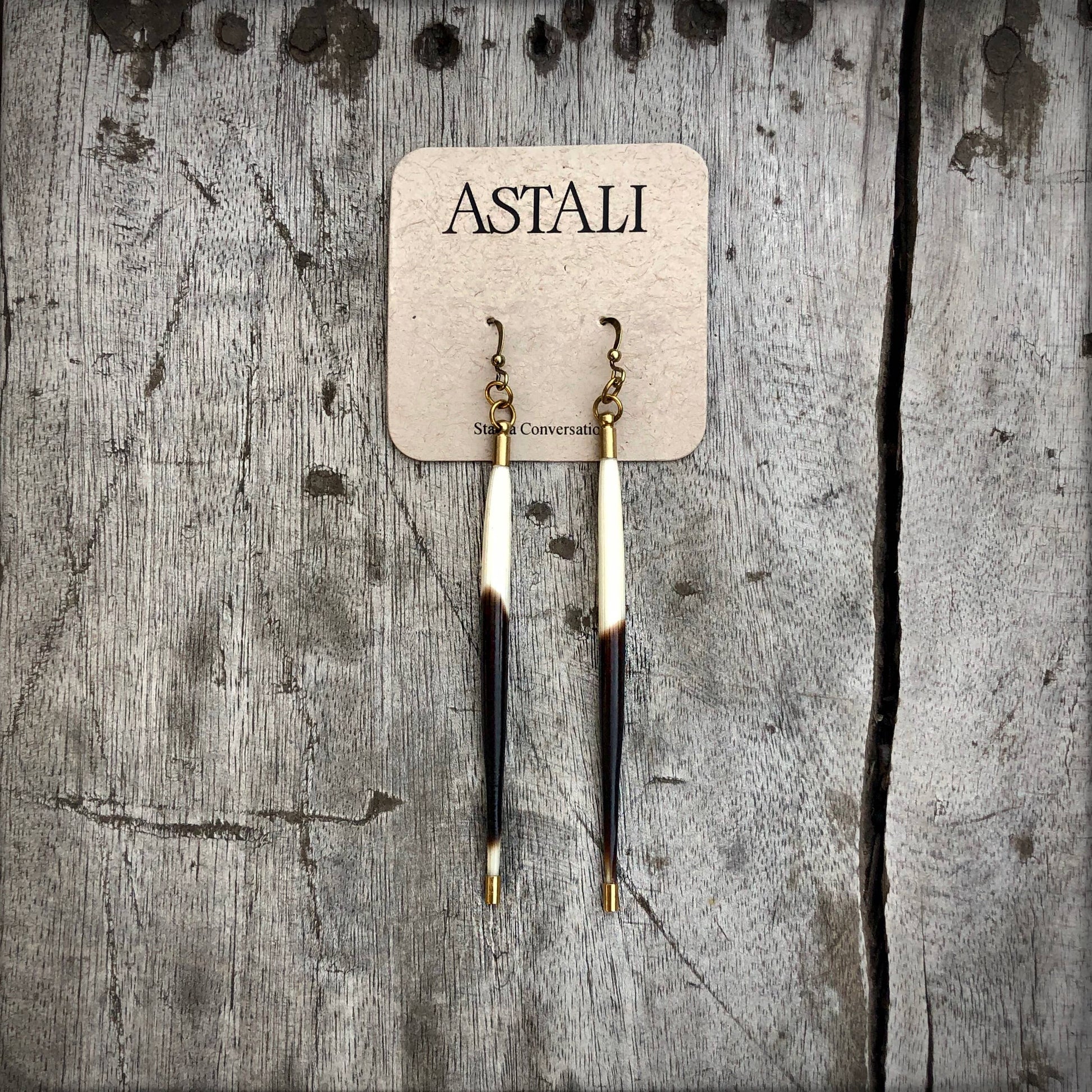 These porcupine quill earrings are made from shed South African Porcupine Quills hanging from brass earhooks.