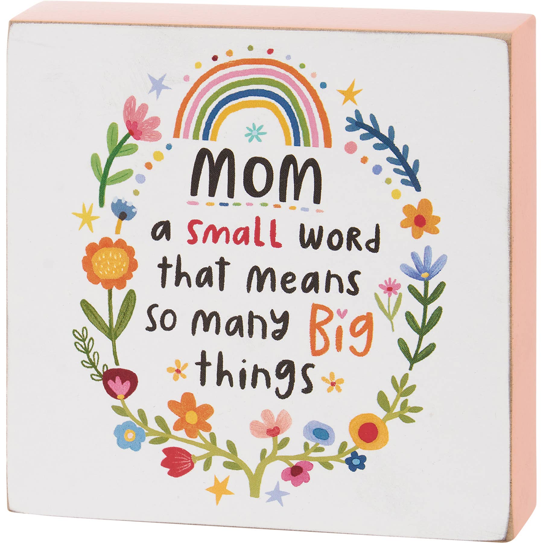 An inspirational wooden block sign from our Mother's Day Collection displaying a vibrant hand painted floral design with rainbows and loving sentiment. Hand illustrated sentiment reads "Mom - A Small Word That Means So Many Big Things." Sides feature pink color for added interest.