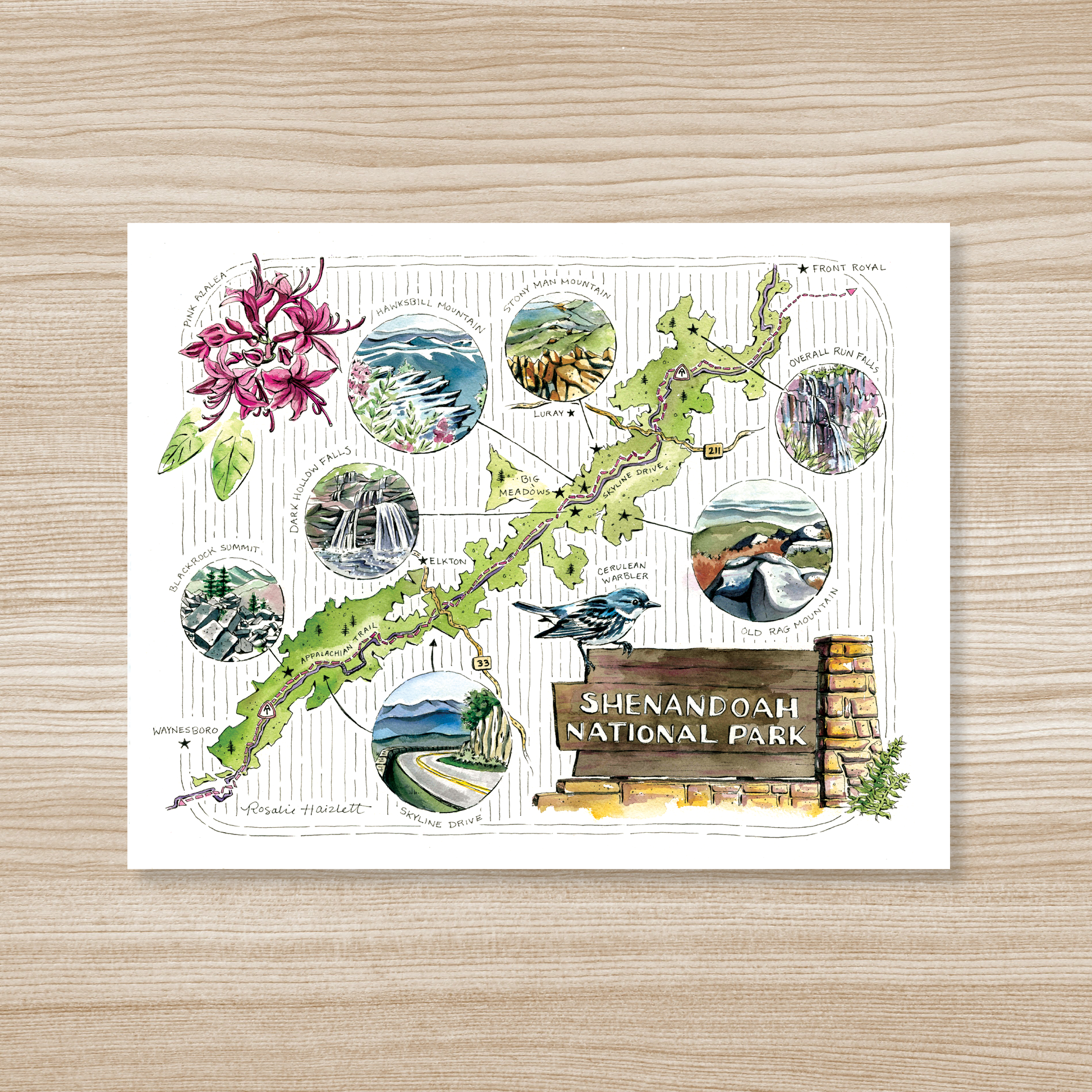 A timeless, hand-illustrated map by Rosalie Haizlett that captures the beauty of Shenandoah National Park in watercolor and ink.