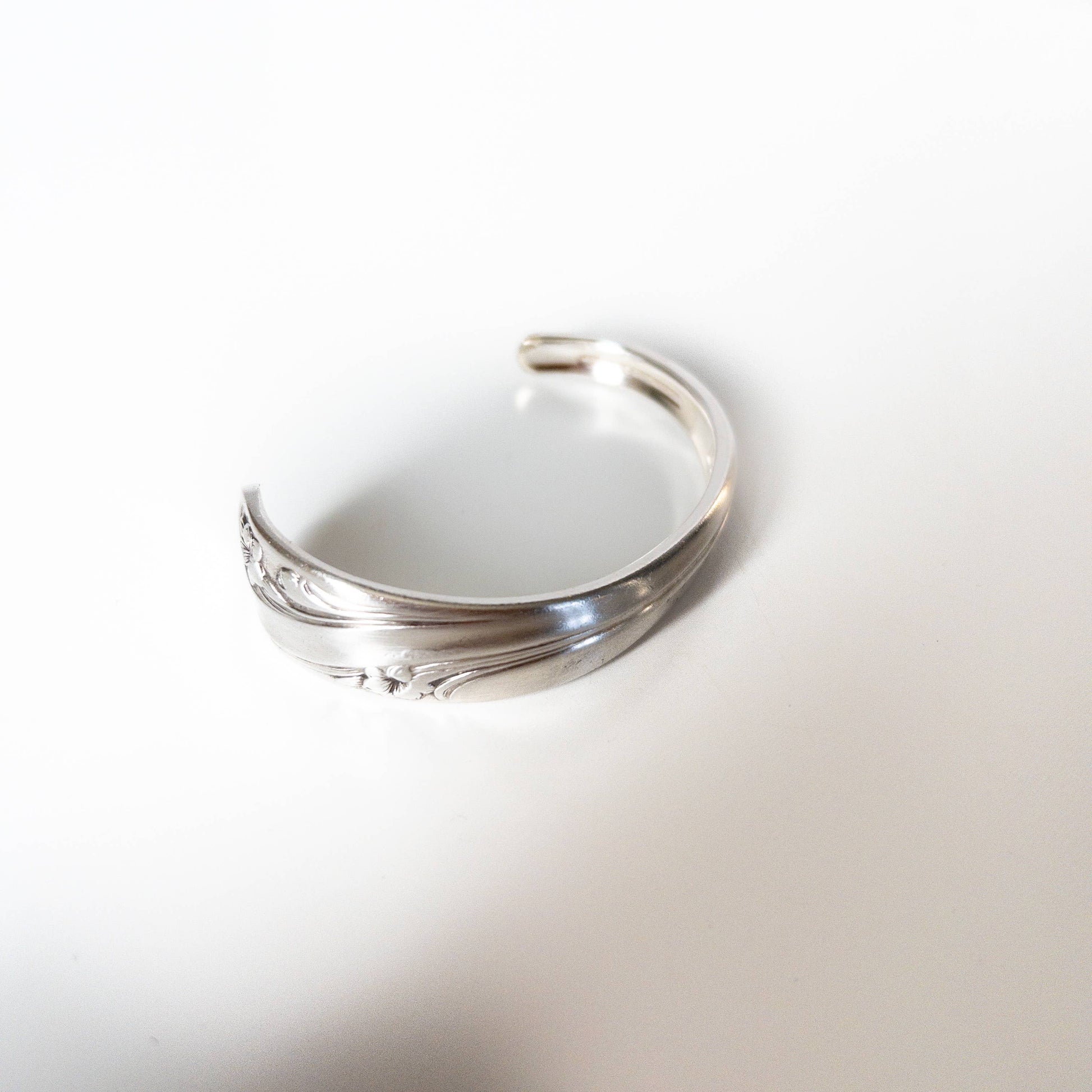 These beautiful cuff bracelets are a simplified version of our classic silverware handle ID bracelets. It is made from a single piece of vintage silverplate silverware that has been lovingly cut, sanded and shaped to fit securely on the wrist with no chains or clasps needed!