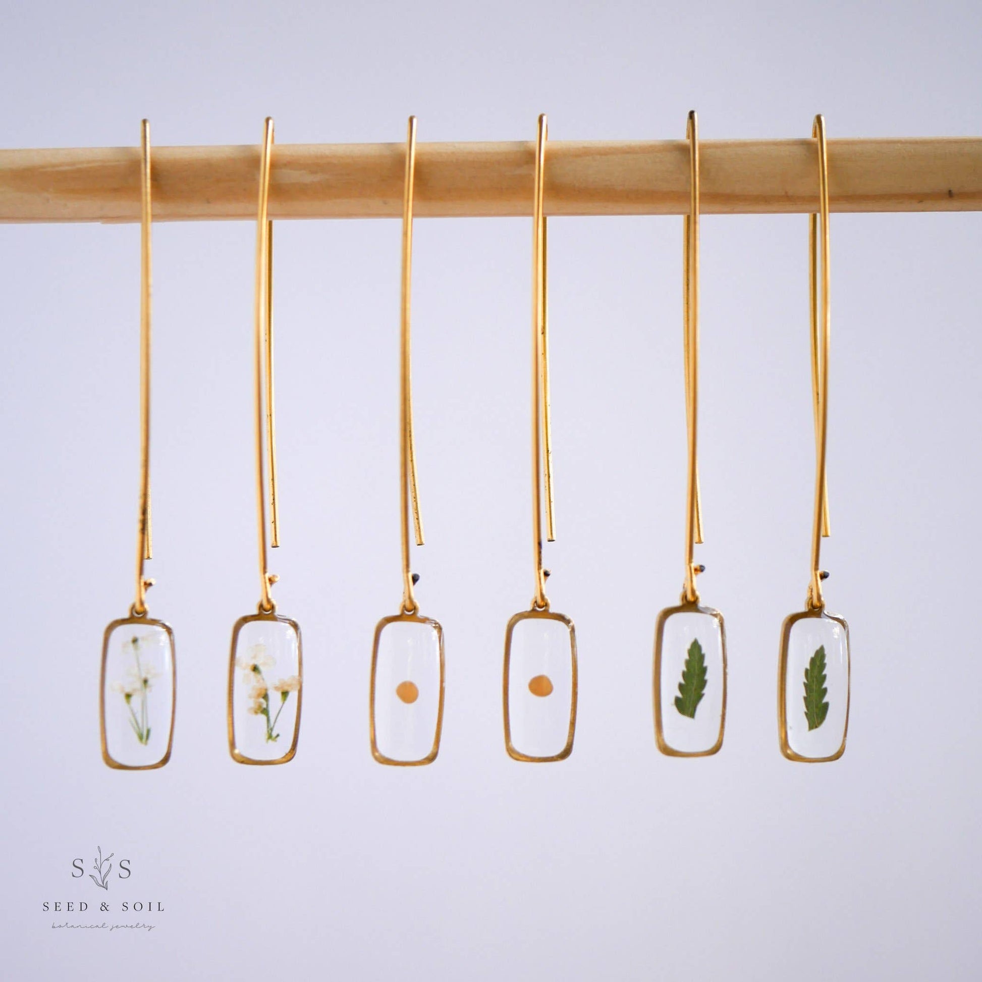 A delicate brass rounded rectangle frame dangles from the end of a 24k gold plated threader ear hook.