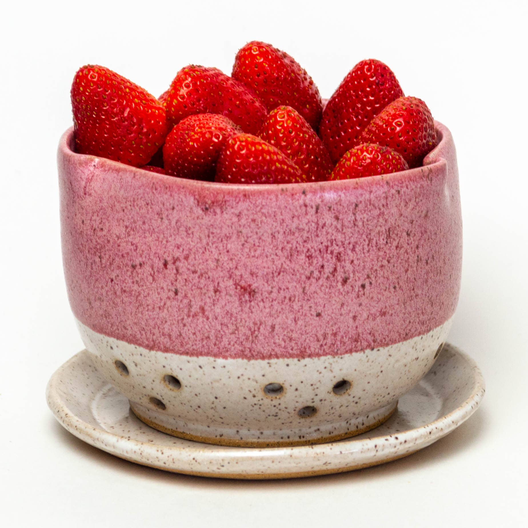 This beautiful stoneware ceramic berry bowl/colander/ orchid pot is hand-thrown and hand-glazed in Ohio, USA. Food, dishwasher, and microwave safe. It measures approximately 3.5 inches high & 5 inches wide and comes with a saucer 5.5 inches in diameter. Drain hole designs will vary. All our ceramic items are handmade and will vary from one to the next.