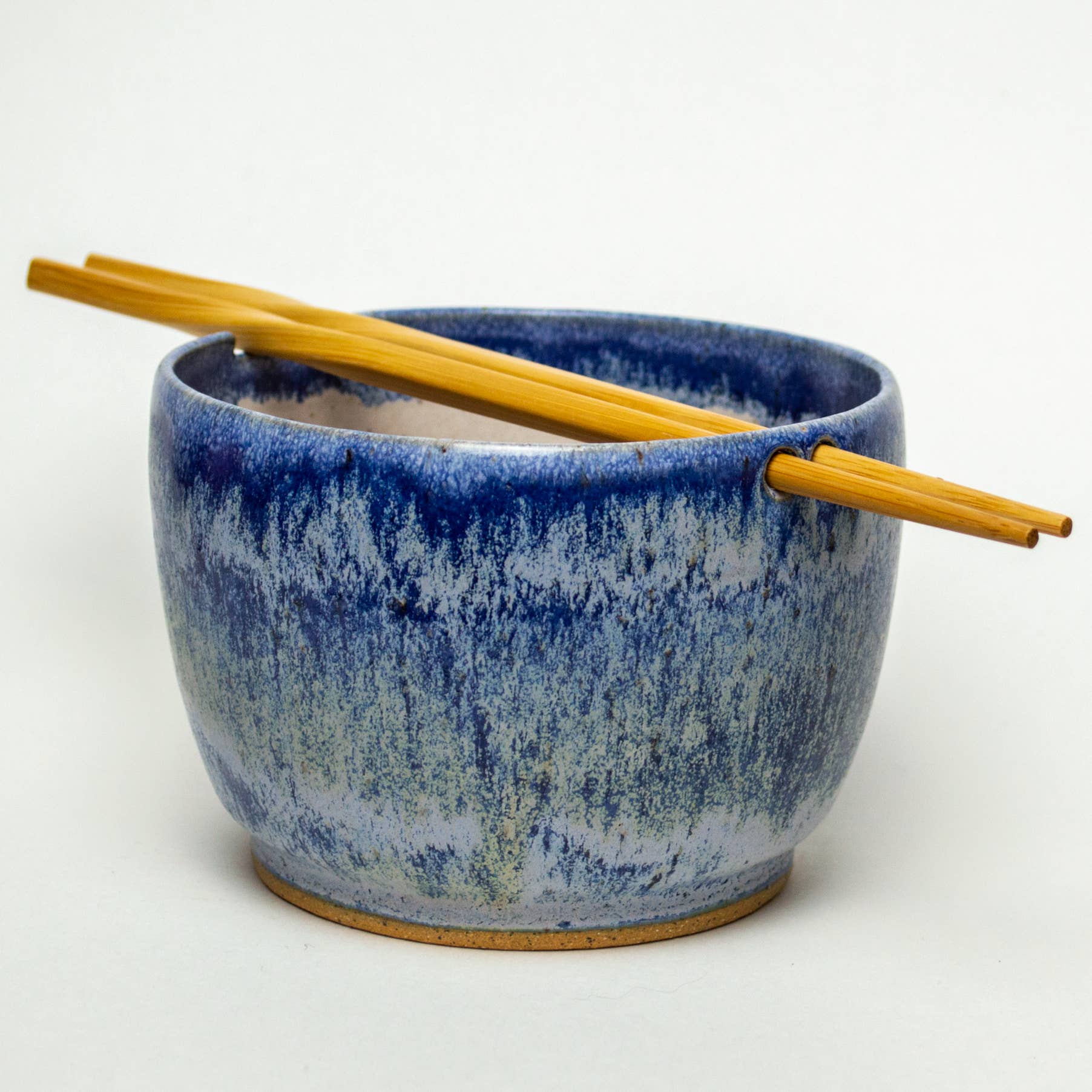 This beautiful stoneware ceramic rice/noodle bowl with chopstick holder is hand-built and hand-glazed. Comes with 1 set of wooden chopsticks. Food, dishwasher, and microwave safe. Measures approximately 4 inches high and 5 inches wide.