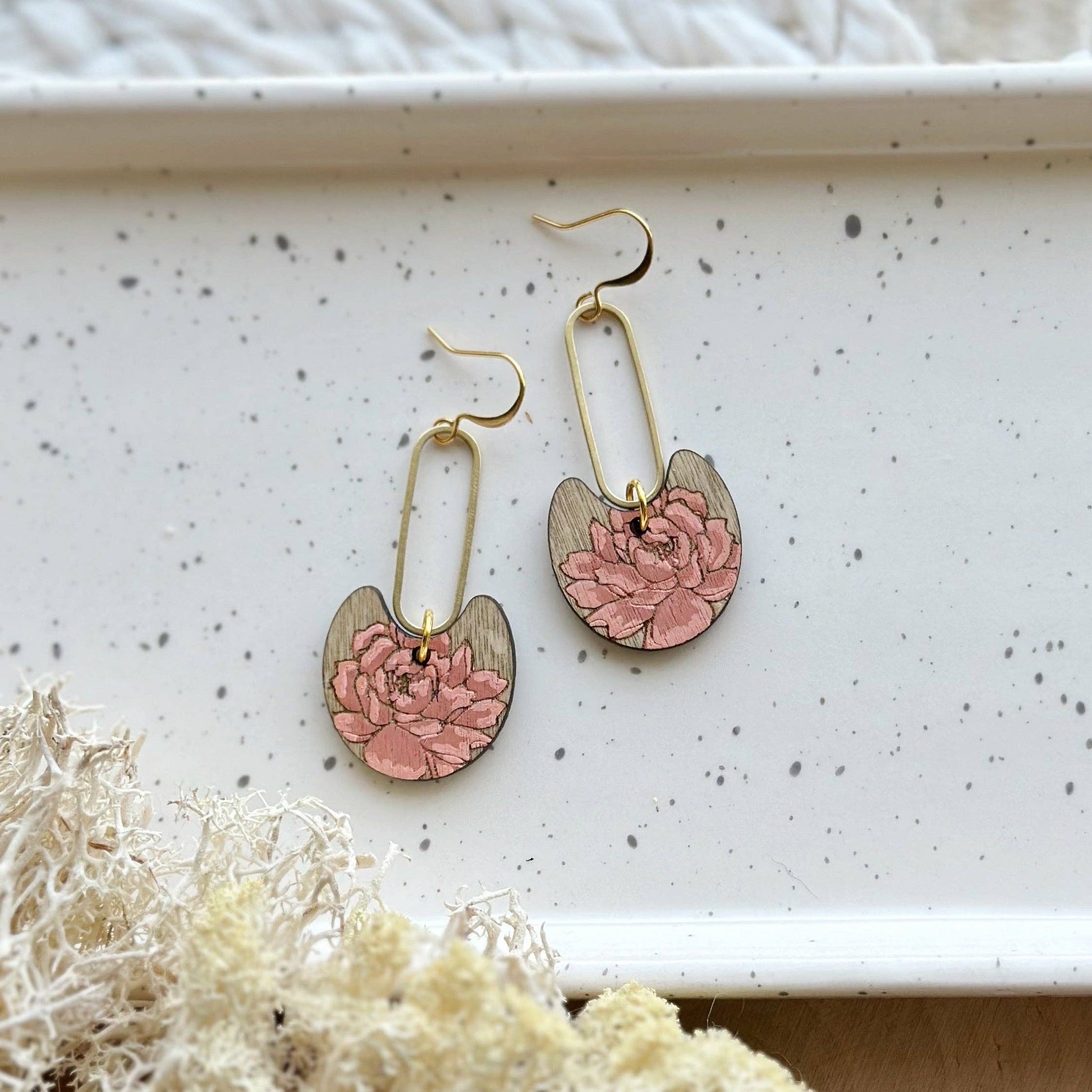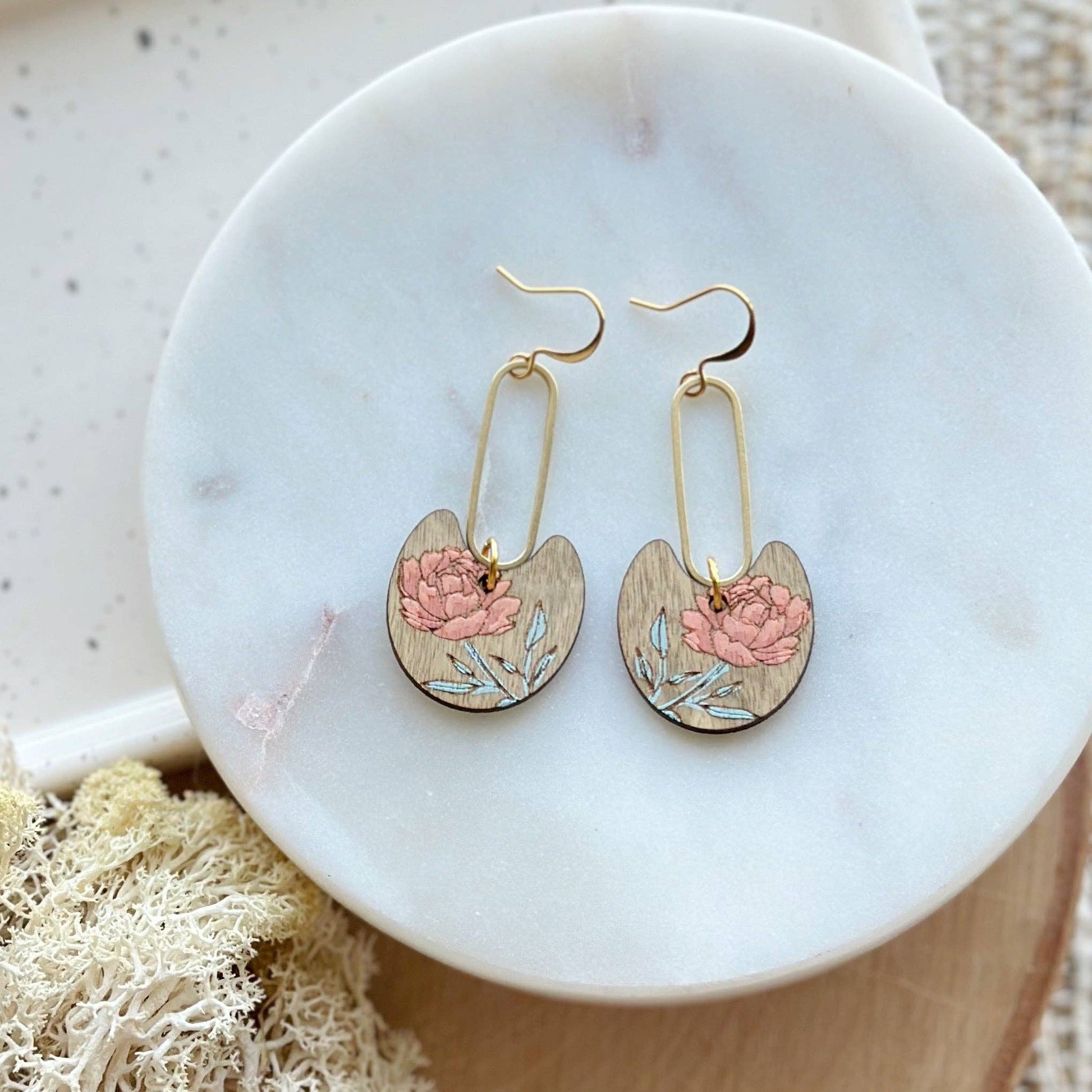A beautiful and unique everyday drop that's made to wear everywhere. Inspired by a Pacific Northwest garden. Approximately 1 3/4" x 7/8" Made from hand painted basswood, raw brass, and hypoallergenic gold-plated brass ear wires. Designed, engraved, and assembled in Selah, Washington.